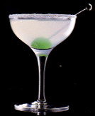 シェークして砂糖のスノースタイルにしたカクテルグラスに注ぎ、ピンに刺したミントチェリーを沈める