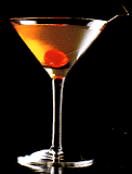 ステアしてカクテルグラスに注ぎマラスキーノチェリーをピンに刺して飾る。レモンピールを絞りかける。